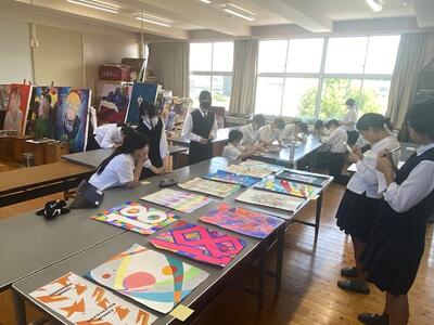 令和5年9月21日(木)今年度開催の御船高校芸術コース発表会のポスター制作をしています。生徒全員が制作した作品に対して、付箋に評価をして制作者に渡します。お互いの良い点や改善点等を伝え合うことで健全な批判力を身につけます。
