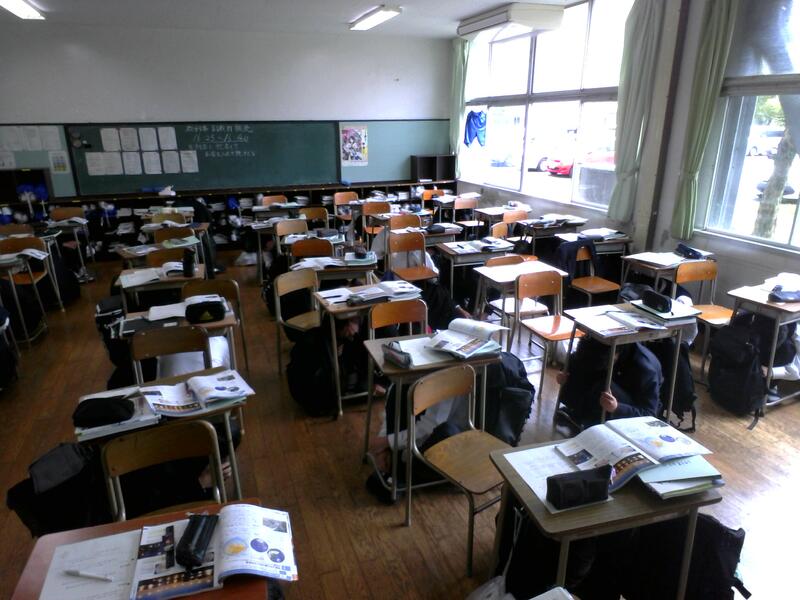 4限目にシェイクアウト訓練が行われ、授業をしていた電子機械科1年生の生徒たちはしっかりと放送を聞いて身を守る行動がとれていました。
