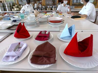 2学期最初のフードデザインの授業では、テーブルコーディネートの実習をしました。調理室の様々な食器を並べて、テーマに沿ったコーディネートを考えたり、テーブルナフキンの折り方を練習しました。