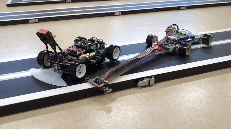 マイコンカーと呼ばれる全自動で走行するロボットカーを製作し,その速さを競う競技のことです。F1マシンよりはるかに速い制御が必要なマシンを各自で開発して自動運転させ,どのマシンが日本で一番速いかを競う大会です。