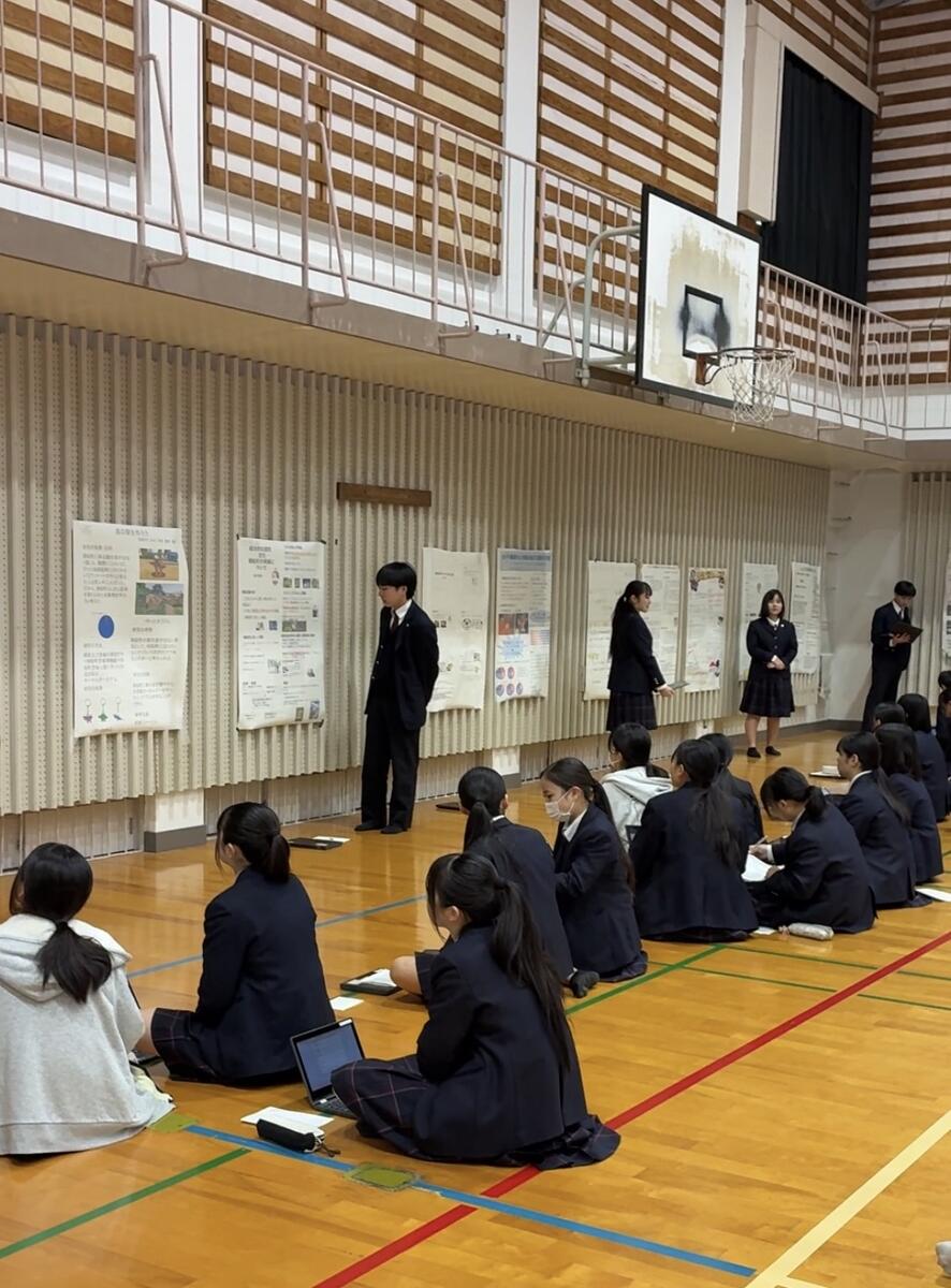 本校では、生徒が自ら課題を見つけ、解決に向けたプロセスを自律的に進める「探究活動」を教育の柱の一つとして位置づけています。今回の発表会は、その集大成となる場で、生徒たちは、自ら設定した多岐にわたる研究テーマについて、その背景や分析結果を広用紙にまとめたポスターを用いてプレゼンテーションを行いました。