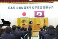 令和2年度熊本県立御船高等学校「第73回卒業証書授与式」の日です。卒業生は、普通科(芸術コース含む)111人、電子機械科59人、合計170人です。三か年皆勤の表彰者が25人います。熊本県での感染者は減少しましたが、依然、新型コロナウイルス感染症は終息しておらず、昨年に引き続き、卒業生と教職員、そして各家庭から原則1人の保護者の方と出席者を限定し、簡素な式典となりました。