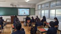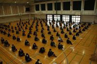 修了式実施に向けて、総務部を中心にそのあり方を検討し、2年生は体育館に入り、1年生は各教室にてオンラインで参加するという分散方式をとりました。2年生は個人間の距離を十分にとって、体育館のフロアいっぱいに広がり座ります。体育館での式の状況をカメラで中継し、その映像が各教室前方のスクリーンに映し出されます。