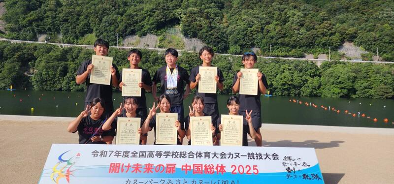 カヌー部は、2年生4人(男子3人女子1人)、1年生8人(男子2人女子6人)の計12人で活動しています。令和7年度のインターハイでは、男子が昨年に引き続き学校対抗で2年連続総合優勝、女子も延べ3つの種目で入賞を果たしました。中学からの経験者もいますが、ほとんどの生徒は高校からカヌーを始めます。今年インターハイに出場した選手の中にも、高校からカヌーを始めた選手は複数います。初心者でも努力次第では全国大会や国体にも出場できる部活動です。練習はきついこともありますが、皆高い目標を達成するために互いに励ましあって練習しています。また、競り舟大会や地域のカヌー教室にもボランティアとして参加することもあります。