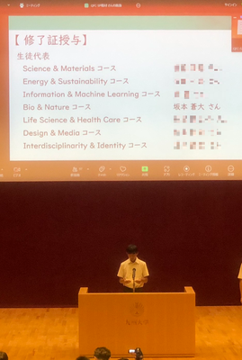 先日、閉講式が行われ、なんと本校生徒が、全参加者の中でBio&Natureコースを代表して「受講生代表スピーチ」の大役を務めました。