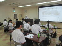午前は熊本保健科学大学より水本教授にお越しいただき、ご講話いただきました。実際に大学の教科書から今の学びを振り返り、社会やしごとにどうつながっていくのか、今の学びとの関連性はどのようなものがあるか、ということを中心にお話いただきました。生徒は思い思いに興味のある教科書を手に取り、真剣に読み込んでいました。