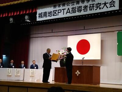 10月21日(土)に、芦北高校で開催された大会に、小嶋会長、菅校長はじめ本校から10名参加しました。開会式では、先日受賞した優良PTA文部科学大臣表彰の紹介があり、小嶋会長が賞状を受け取りました。