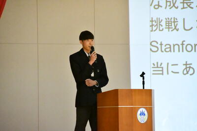スタンフォード大学とのオンライン講義を経て、最終プレゼンで成績優秀者に選ばれた梅川さんと平石くんが、英語でスピーチを行いました。二人の流暢な英語に会場は圧倒されましたが、何より心に響いたのはその決意です。梅川さんは「世界とつながる活動を通し、将来は水俣の発展に貢献したい」と語り、平石くんは「異文化への興味を持ち、挑戦し続ける大切さをみんなに伝えたい」と力強く呼びかけました。2人は、8月にアメリカのスタンフォード大学で行われる成績優秀者表彰式に出席予定です。