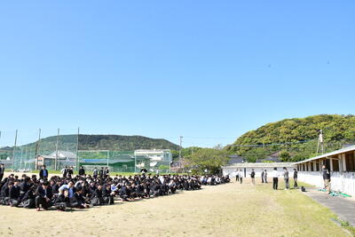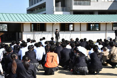 熊本地震の発生から大切な節目となる4月16日、本校で防災避難訓練を実施しました。訓練の中で、全校生徒・職員で黙とうを捧げ、震災で犠牲になられた方々への哀悼の意を表すとともに、防災への誓いを新たにしました。