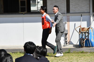 今回は火災発生を想定し、各教室からグラウンドへの避難を行いました。初の試みとして取り組んだのが「避難遅れの生徒を捜索する訓練」です。刻々と変わる状況下で、いかに正確に情報を共有し、仲間を助け出すか。実戦さながらの緊張感の中、迅速な捜索と救助の流れを確認することができました。続いて、津波発生を想定した体育館への二段階避難も行い、全校生徒が落ち着いて行動しました。