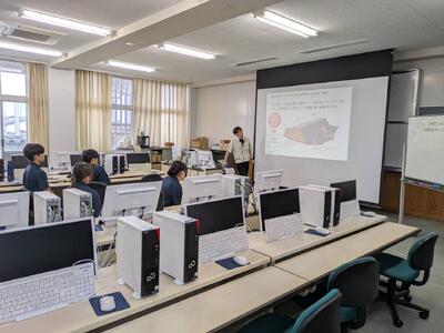 先日、建築2年生対象に、職員によるDX(デジタルトランスフォーメーション)授業を実施し、昨年度の基礎学習を土台に専門性の深化を図りました。ICT建機を動かす「3次元設計データ」の理解 現場の効率化・省人化を実現するICT建機(情報通信技術を活用した建設機械)は、3次元設計データを活用することで、正確かつ無駄のない作業を実現します。生徒は、このデータが工事の省力化・省人化の鍵であることを理解し、デジタル設計図面を作成するための基本(線形要素を用いたデータ作成要領など)を学びました。さらに、地形解析の基礎となる「三次元座標」と「TINデータ」 建設・測量において不可欠な、現場の地形を正確にデジタル化する技術を学びました。