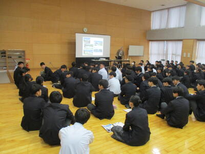 講義ではまず、坂田建設の坂田様より、「建設業の役割と地域の防災・減災」について熱いメッセージをいただきました。多様な職種(仕事)をサッカーのポジションに例えて解説され、生徒にも身近なイメージで建設業の全体像が伝わりました。