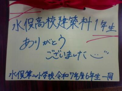 今回のプロジェクトを通して、新栄合板工業様からいただいた合板は、単なる「雑巾がけ」というモノを超え、「地域を想う心」と「ものづくりの楽しさ」を繋ぐ架け橋となりました。水俣高校建築科は、これからもスローガンである「Design Smiles, Build Future!」を胸に、技術を磨き、地域に笑顔をデザインし続けていきます。水俣第二小学校の皆さん、素敵なメッセージを本当にありがとうございました!