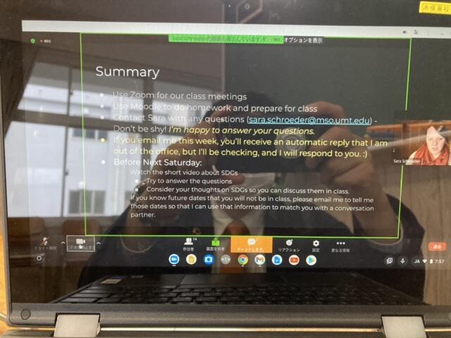 先日熊本県立学校全校で配布されたChromebookを活用して、応募生徒10名がモンタナ大学担当者のSara Schroeder さんから、Zoomの使い方やモンタナ大学Moodke(オンライン学習システム)について、そして11月20日(土)に実施される第1回目の授業に向けた課題の説明を聞きました。(Of course in English only !)まだまだ積極的に質問や意思表示をできない生徒もいたようですが、2ヶ月後のプログラム修了後、彼女たちの心にどんな変化が生まれているかとても楽しみです!