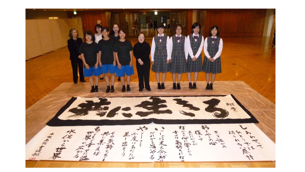 平成29年10月15日(日)に開催される「もやい直しセンター開館20周年記念事業 金澤翔子 席上揮毫・金澤泰子 講演会」において、水俣高校書道部が書道家の金澤翔子さんとコラボレーションし、一つの作品を完成させる予定です。貴重な機会をいただき緊張していますが、本番に向けて一所懸命練習中です。当日は入場無料となっておりますので、ご観覧いただければ幸いです。応援よろしくお願いします。