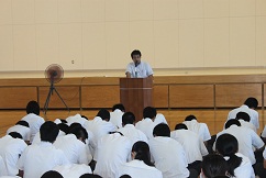 17日(金)に1学期終業式が行われました。スライドを交えて校長先生から心に残るメッセージをいただきました。「百聞は一見にしかず、百見は一考にしかず、百考は一行にしかず。」を胸に、全校生徒がさらなる前進をしてくれると思います。また、教務・進路指導・生徒指導の各主任主事からもお話がありました。