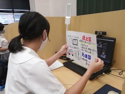 本校生徒は紙芝居で解決策を発表し、その後は関東や中部地方などの中高生とオンラインで交流しながら、テーマに基づくディスカッションやプレゼン作成を行いました。気候問題への関心を高めるアプリ開発や発展途上国への技術提供など、ハイレベルな議論が行われました!