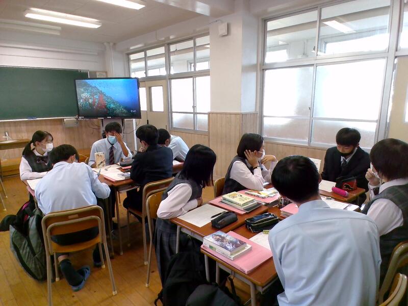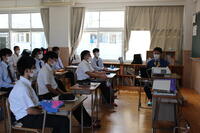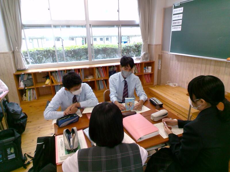 1年普通科では国語の授業でビブリオバトルを実施しています。おすすめの本からさまざまな会話に発展していきました。5分間の紹介があっという間でした。原稿は一応ありますが、自分自身の言葉で、相手の顔を見ながら伝えました。質問タイムもネタバレしないように、注意しながら答えていました。