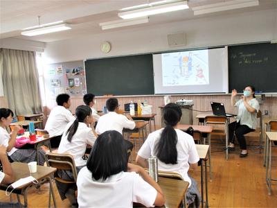 アリシア先生の帰国後、新規ALTがまだ来日できない状況にあり、現在は八代高校からクイン先生が臨時ALTとして月に2回本校に来てくれています。トリニダード・トバゴ出身のクイン先生。生徒たちにとって初めての内容がいっぱいのプレゼンテーションでした(^^)♪