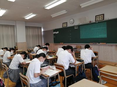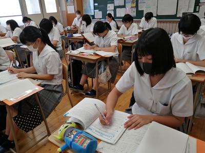 3年生の普通科特進コースでは受験に向けて夕課外を実施しています。英語の夕課外では、英語特化型コース、国公立大コース、私大・短大・専門学校コースに分れ、進路先に対応した入試対策をしています。総合型選抜(AO)や学校推薦型選抜(推薦)の時期が着々と近づいているので、気合い入れて勉強しています!