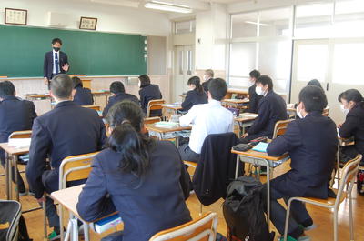学校長からは「平常心を保つこと、最後まで諦めないこと」などのメッセージが送られました。また、進路決定者代表の6組の植田さんからは、「就職試験の時には皆さんに励ましてもらった。今度は僕たちが応援する番です。頑張ってください。」との激励が送られました。