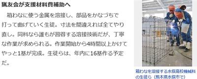 鹿の捕獲量が5年で17倍に増えた熊本県水俣市。被害にあえぐ農家を助けようと、県立水俣高校の機械科生徒が捕獲用の箱わな作りに立ち上がった。作り方は佐賀県内の猟師に学び、授業で学んだ溶接技術を応用する。完成品は無料で農家に提供する。生徒の思いに共感した地元猟友会は材料費の補助や、生徒らが狩猟免許を取得する費用を援助する考え。地域を挙げた捕獲作戦が動きだした。(日本農業新聞より)