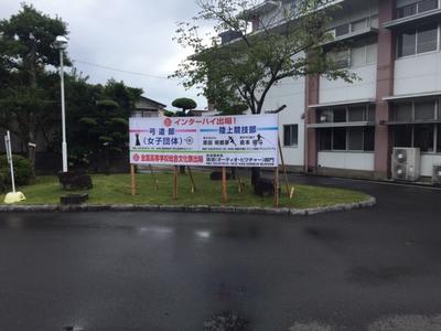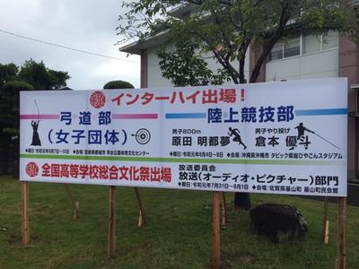来月、運動部(弓道部、陸上競技部)及び放送委員会が出場する全国大会に向けて看板が設置されました。