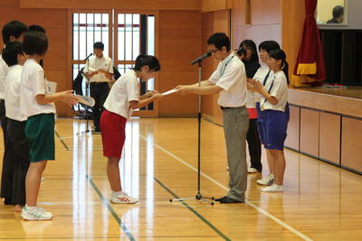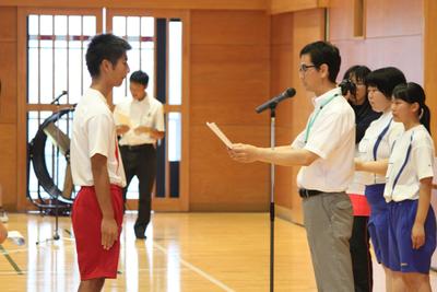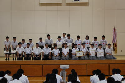今日で1学期が終了しました。終業式の前には1学期間で部活動の大会で活躍した生徒の表彰式と高校総体、高校総文祭で全国大会に出場する生徒たちの推戴式を行いました。