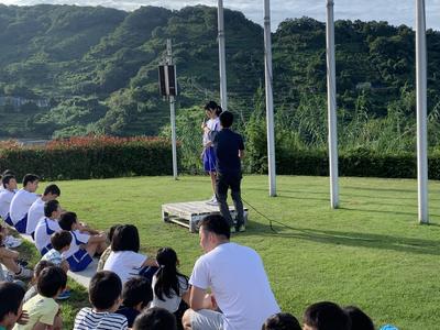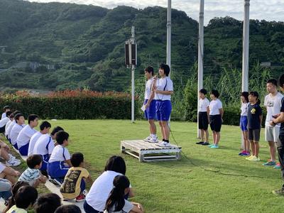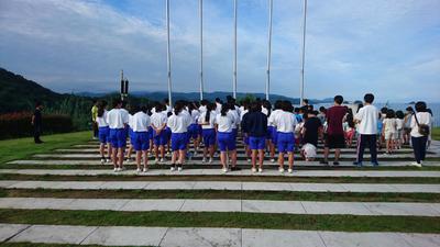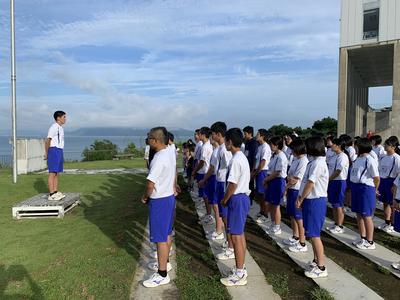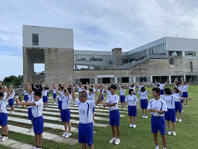 昨日夜から吹奏楽部の生徒も加わり、53名で2日目の朝を迎えました。病気や怪我もなく、朝食ももりもり食べました。朝の集いでは、景色が良いなかラジオ体操や代表生徒による本校紹介などがありました。まだ眠さの残る表情から少しずつ目を覚ました様子でした。