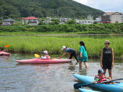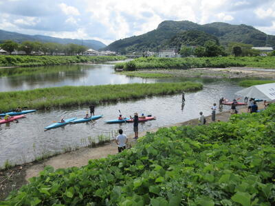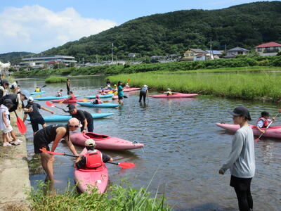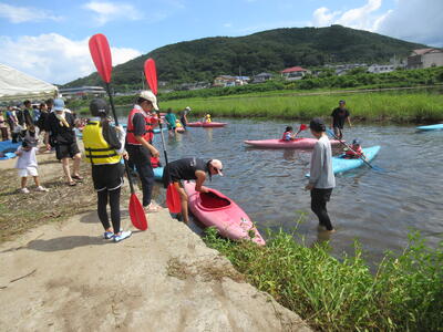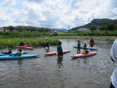 はじめにパドルの使い方を生徒が小学生に講習し、川で乗艇しました。乗艇のサポートや漕ぎ方を教えていました。参加した小学生の皆さんは、高校生になったらぜひカヌー部に入部してくださいね。