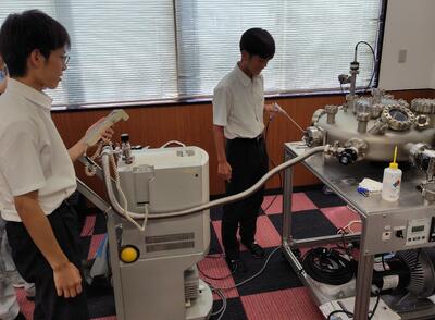 2年生は、半導体製造装置のリークチェック(真空漏れチェック)の体験をしました。製造装置は内部を真空状態にし、回路を製造することで品質管理を行っています。したがって、装置の真空漏れは製品の品質に大きな影響を与えます。作業内容は、特殊なガスを装置の接続部に吹きかけ、専用テスターでガス漏れのチェックを行うものです。地味な作業ですが、半導体製造装置のメンテナンスの中でも重要で頻繁に行われる作業です。
