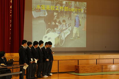 機械科の生徒研究発表では、熊本県工業高校生徒研究発表会でも最優秀賞を受賞した、低炭素社会に向けたEVコンバートのスクーターの製作に関する発表が行われました。実際に研究で作成したEVスクーターを目の前で走らせるなど圧巻の発表が行われました。機械科の発表の後は、商業科の1年生が海外研修に参加して学んできたことを報告しました。香港と日本の街並みや店の商売の考え方の違いなどグローバル化が進む今日の社会の中で生きていくうえで、今後の課題について考えたことなど緊張が見られる中でもプレゼンしました。