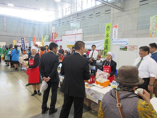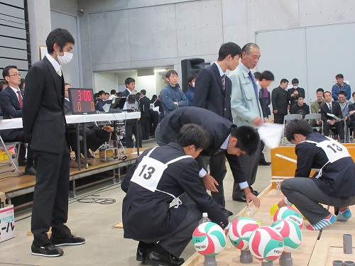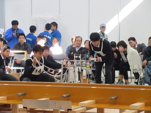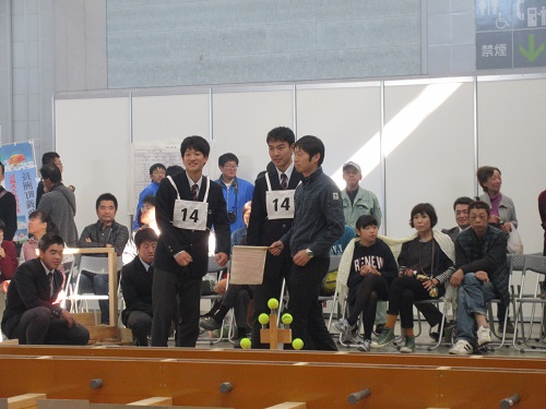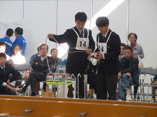 一方、くまもと物産フェアのイベントとして、第26回熊本県高等学校アイデアロボット競技大会も販売会場と隣り合わせで行われました。本校からは機械科の生徒が制作したロボット2台が出場しました。競技は、本年度山口県で開催された全国大会の競技内容に基づいて、16チームが優勝目指して熱戦を繰り広げました。予選の結果、本校の「水公さんと風待号」が決勝トーナメントに勝ち残り、最終的には総合6位、敢闘賞をいただきました。2チームともに、これまで熱心にロボットづくりに取り組んできた成果を十分に発揮できた大会だったと思います。