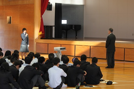 最後は3年生担任の三樹先生から1年生へ、あっという間に就職試験がやってくるので定期試験は一回一回を大切に頑張ろうと話をしていただきました。3年生へは、卒業まであと少しだが、気を引き締めてお互いに有終の美を飾ろうと話をして終わりました。