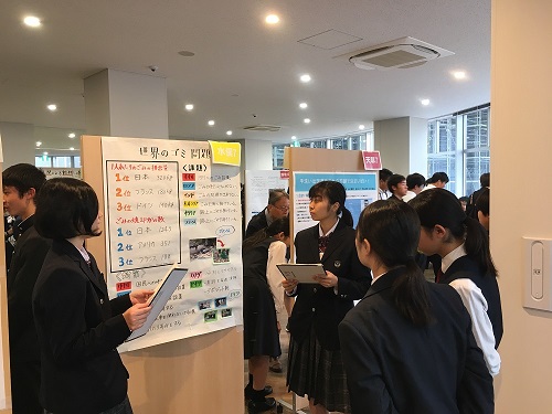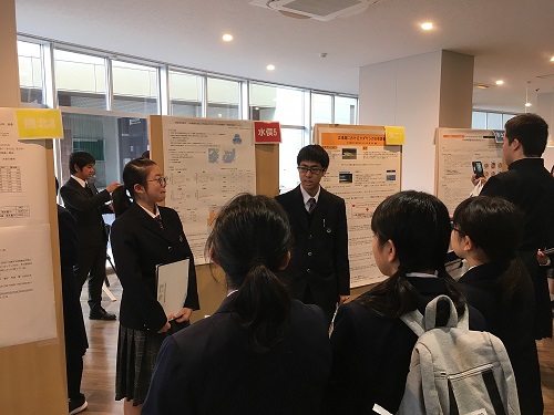 本校からはポスター発表部門に参加し、“Research on the Recovery of Cities Where Environmental Problems Occurred”(環境問題発生地域の復興に関する研究)というテーマで、英語による発表をしてきました。生徒たちは、何度も練習を重ね、本番では多くの参加者を前に堂々と発表をしていました。また、発表後の質疑においては、今後の研究に向けて鋭い指摘もいただき、大変有意義な時間となりました。
