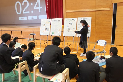 研修では、参加する小中学生を13班に分け、各班に本校生徒が1名ずつつき、班別協議のファシリテーターとして全体進行および班のとりまとめを行いました。班別協議では「理想の学校を作ろう」をテーマに、自分たちの学校を魅力的な学校とするための施策・目標およびその目標達成のための具体的な方策を考え、それを1枚の紙にまとめプレゼンテーションを行いました。