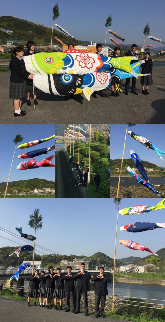 先日は、鯉のぼり事業で鯉のぼりを立ててきましたが、今回は「はつ恋のまちづくり事業」の一環で「恋のぼり」を水俣高校生が中心になって製作することになりました。美術部にデザインを依頼したり、日程から作業工程を考えたり、協力者を依頼したり、生徒自身の手で作り上げました。