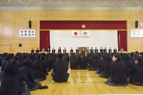 8日(水)に本校体育館において、新任式・始業式が行われました。本年度は岩本校長先生をはじめ、18名の新転入の先生方をお迎えしました。新任式後、始業式が行われ、校長先生から、「学校は我が家、家がうまくいくためには、役割の自覚があること、夢を持つこと、他者を思いやる気持ちが必要である」という話をされました。始業式後には、主任主事の紹介、学年団の発表が行われました。