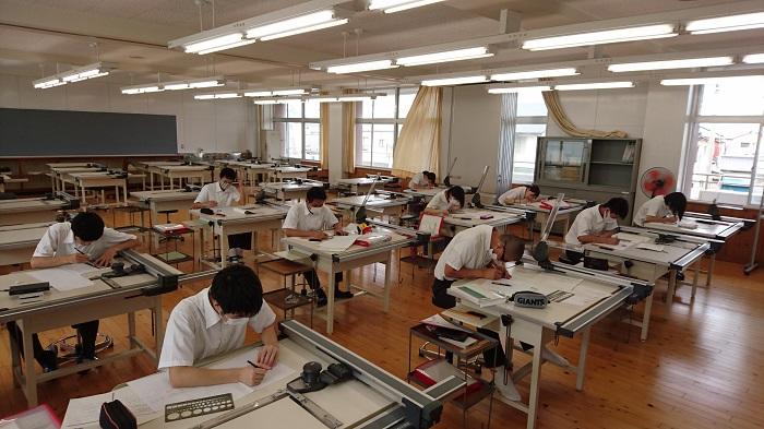 今、建築コース3年生は「選択製図」の時間に二級建築士の実技試験問題にチャレンジしています。今まで学んできた建築の知識や技術を活かして、楽しみながらプランニングを行っています。完成までもう間近です。上手に描けていますね。