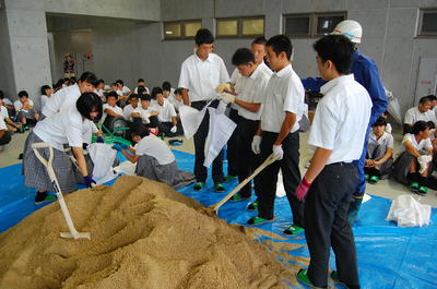 水俣市役所や警察署、消防署、自衛隊の行政機関が中心となって実施された今回の訓練でしたが、生徒、保護者、地域住民の方々とともに土嚢積み、毛布・衣類での担架作成、軽装甲機動車見学、非常食試食など充実したものとなりました。