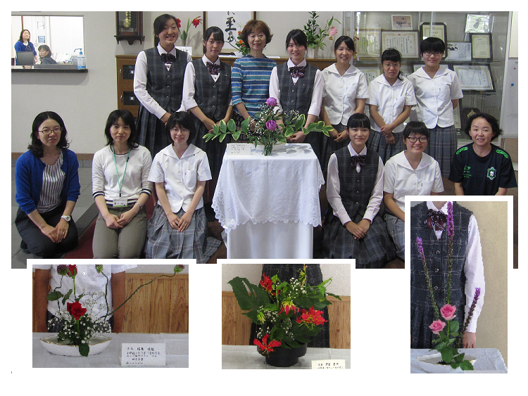 花材をいつもより少し豪華なものにし、作品をつくりました。3年生と新部長の作品が事務室前玄関、そのほかの部員の作品は生徒昇降口に展示しています。それぞれ週末にすっかり咲ききってしまいましたが、生徒・職員・来校者の目を楽しませています。