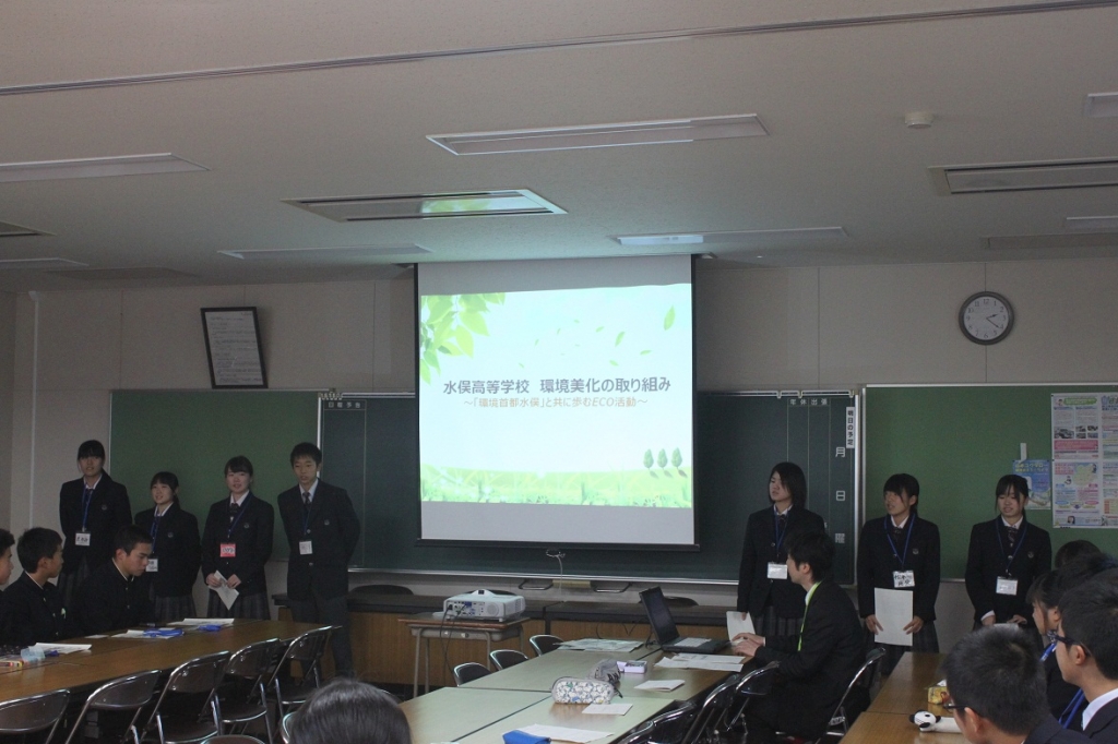 多良木高校生徒会(生徒16名、職員2名)が来校して環境教育視察研修を行いました。水俣高校の環境活動の取り組みについて、パワーポイントを用いて美化委員が発表しました。その後、「節電・節水」「ゴミの分別」「地域との連携」「環境美化の取り組み」のテーマごとにグループディスカッションを行い、意見をまとめ、それぞれにこれから取り組めることを発表しました。この研修を通して、多良木高校との交流が深まるとともに、新たに環境美化への取り組みも充実させるいい機会となりました。