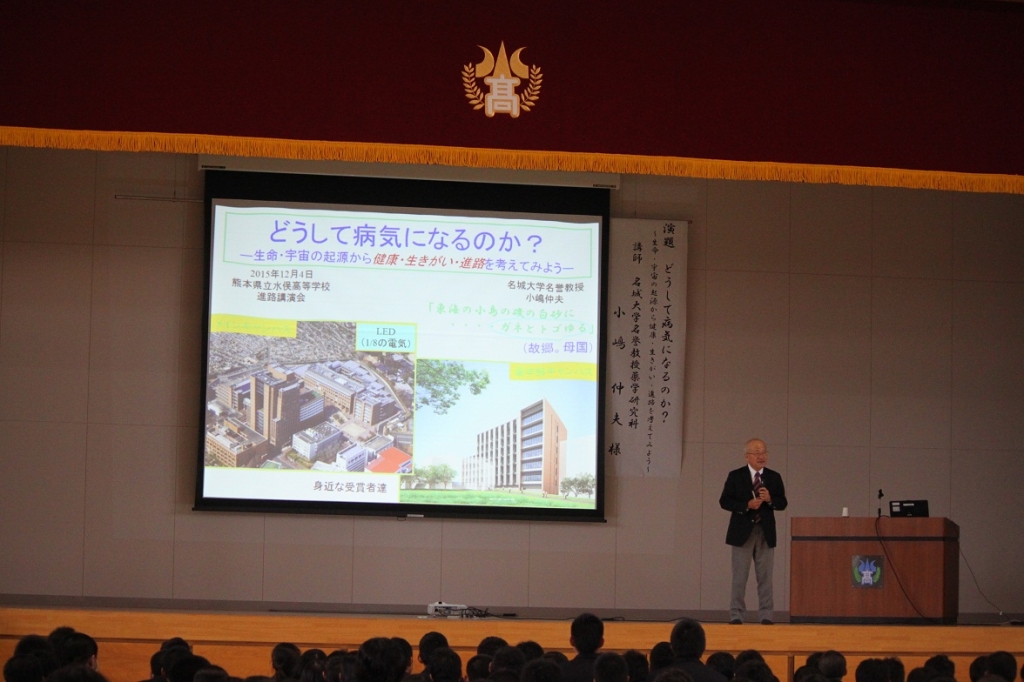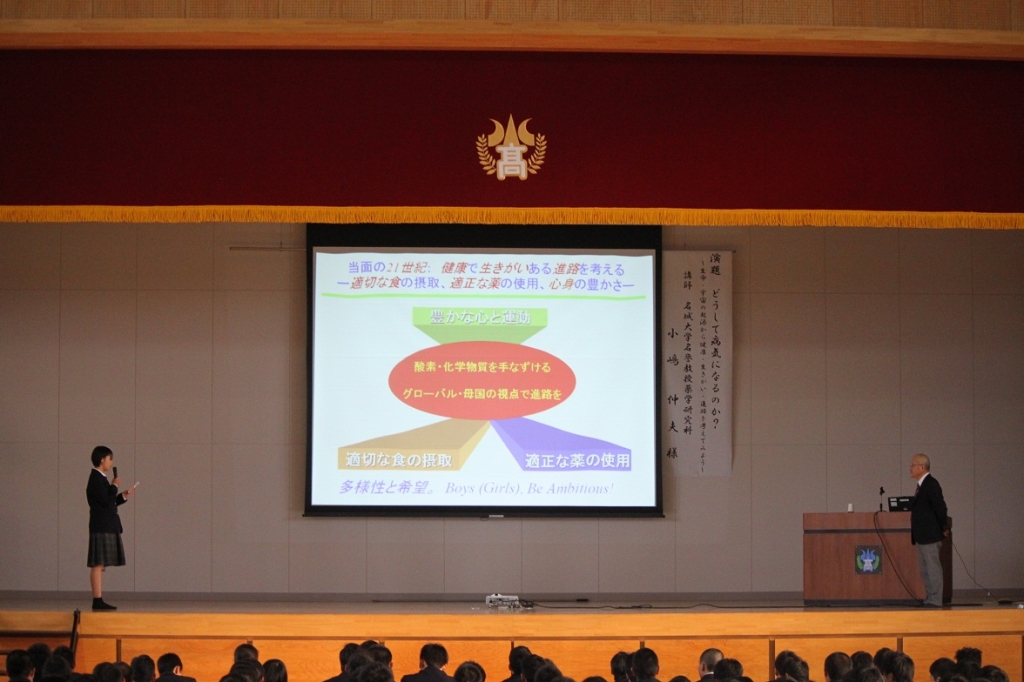 4日(金)に1・2年生を対象に進路講演会が行われました。本校OBであり、名城大学名誉教授薬学研究科の小嶋仲夫様を講師にお迎えして、「どうして病気になるのか?-生命・宇宙の起源から健康・生きがい・進路を考えてみよう-」という題でご講話いただきました。講話では戦後70年で人口が増加した背景やその理由に薬の役割が深く関わっていること、どうして病気になるのか、健康で生きがいある進路を考えるようになどの内容についてご教示いただきました。最後に「多様な人間になって欲しい。希望をもって頑張ってください。」との言葉をいただき、生徒達も明日からの授業への意欲を高めるとともに、これからの進路選択に有意義な機会を得ることとなりました。