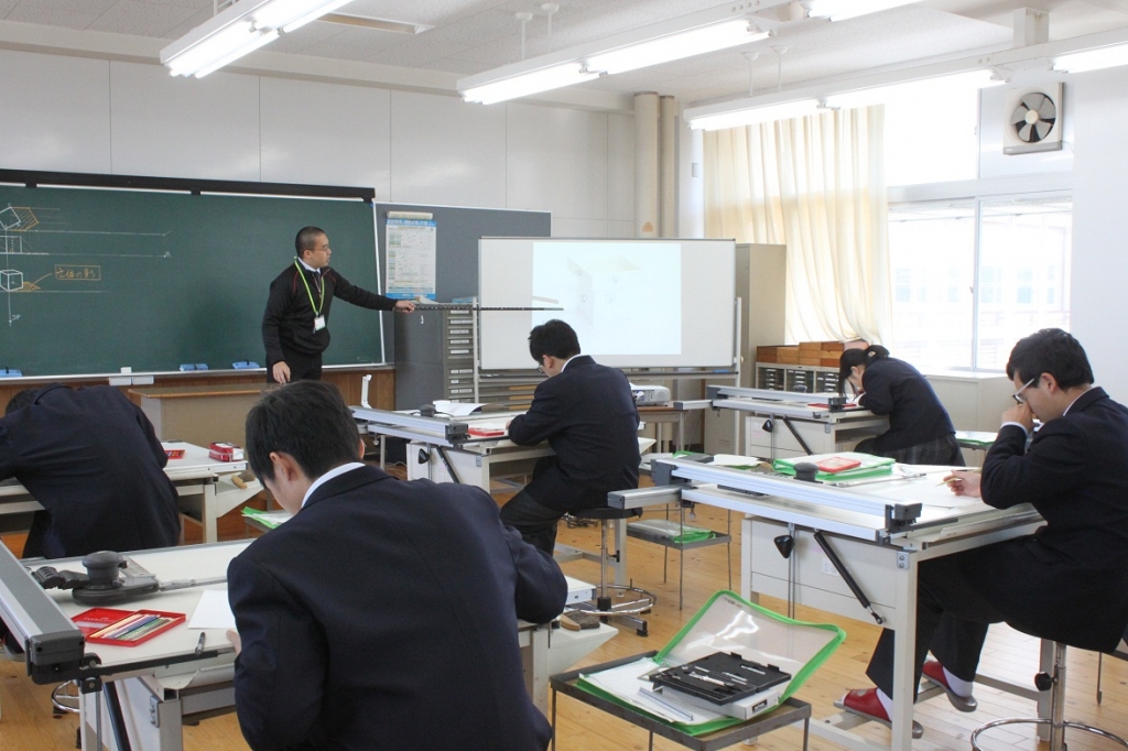 電気建築システム科2年生の実習の様子です。電気コースでは、デジタルIC基礎・高圧実験・電気工事・ラジオ製作など、建築コースでは、建築製図(パース)や木工・測量・CAD・資格取得などのテーマで1年間実習を行っています。1年生の時より実習の内容が専門的になり、技術を習得するべく与えられた課題に一生懸命取組んでいました。