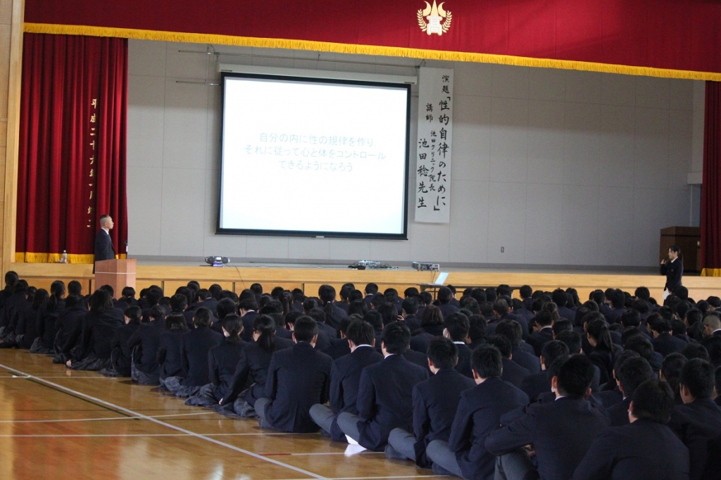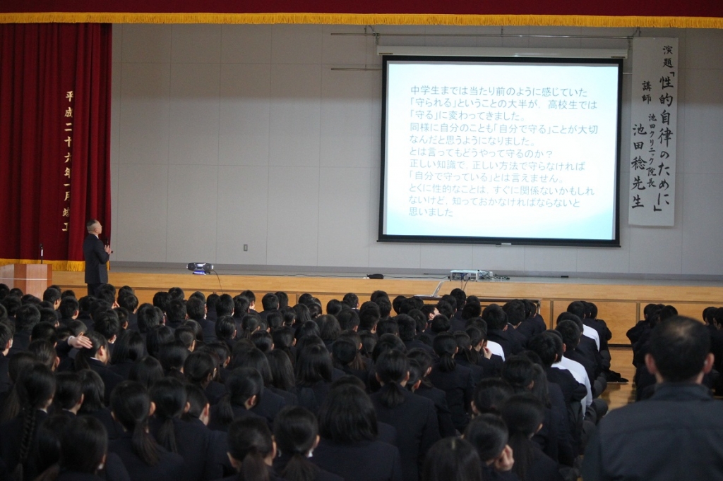 9日(水)に本校体育館にて性教育講演会が行われました。池田クリニック院長の池田稔先生を講師にお迎えして、「性的自律のために」という題でご講話いただきました。講話では、第2次性徴の発達障害について体の性差やプライベートゾーンなど、また性感染症の増加や怖さについて話していただきました。その中で、「みんなの命は多くの命をつないでもらった結果のひとつ。皆それぞれ違うように生きてそれぞれ尊重されるもの」、「性の基本は、自分を大切にし、自分を守ること。自分の気持ちをいつわらない。そして相手を思いやることが大事」とのお言葉をいただきました。生徒達も性について、改めて考える良い機会になったと思います。