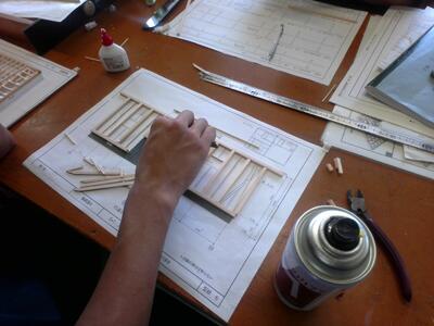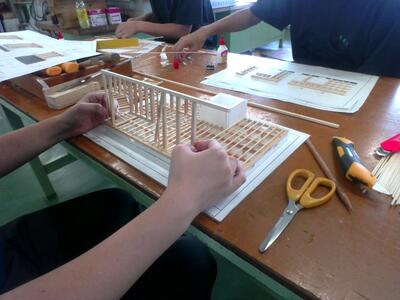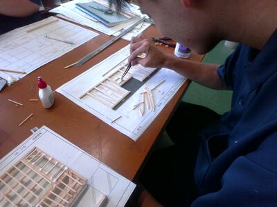 建築科1年生による軸組模型製作もいよいよ大詰めです!前回までの軸組(骨組み)に続き、4回目の実習では建物の輪郭を形作る壁の立ち上げと、建物の傘となる小屋組み(屋根の骨組み)の製作に取り掛かりました。