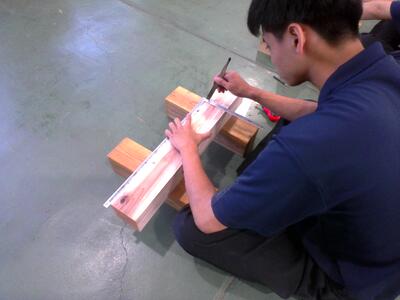 最初は、さしがねの表と裏の使い分けに戸惑ったり、角材を一周しても始点と終点の線がうまくつながらなかったり…と、予想通り手こずる場面も。しかし、そこは未来の建築家たち。集中して練習を重ねるうちに、みるみるうちにコツを掴み、誤差のない正確な線が引けるようになりました。