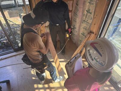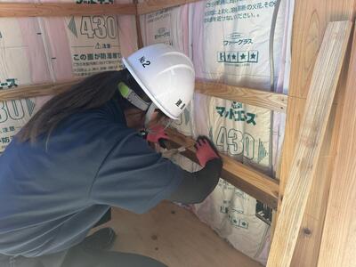 現場では、先輩だけでなく大工さんからも直接指導を受け、建物の構造を支える「貫(ぬき)」と呼ばれる部材の釘打ちにも挑戦しました。