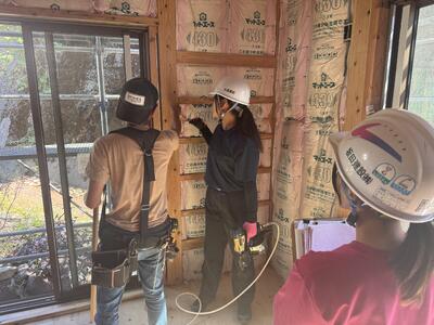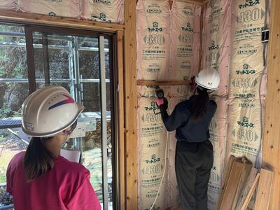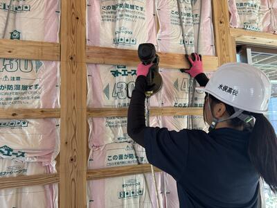 今回、特に注目したいのは、住宅の木造新築工事現場で奮闘している生徒です。この現場を任されているのは、なんと水俣高校建築科のOG(卒業生)