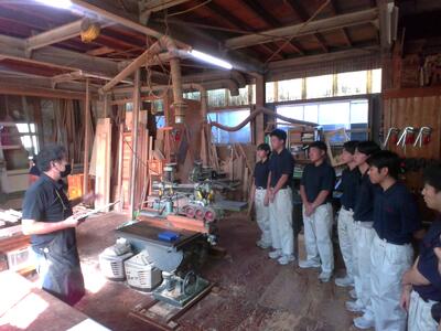 生徒たちは、伝統工法である組子(くみこ)の加工を先に手作業で体験済です。手作業で木材を寸分の狂いもなく組むことが、どれだけ難しくて、どれだけ集中力のいる作業かを知っていたからこそ、工場で初めて建具製作専用の機械を目の当たりにしたとき、「すげえ!」「なるほど!」と驚きの声が上がりました。これは、単に機械がすごいという感動じゃなく、手加工の難しさを知っているからこそ、プロの技術と機械の正確さ、効率の良さを心から理解した瞬間です。